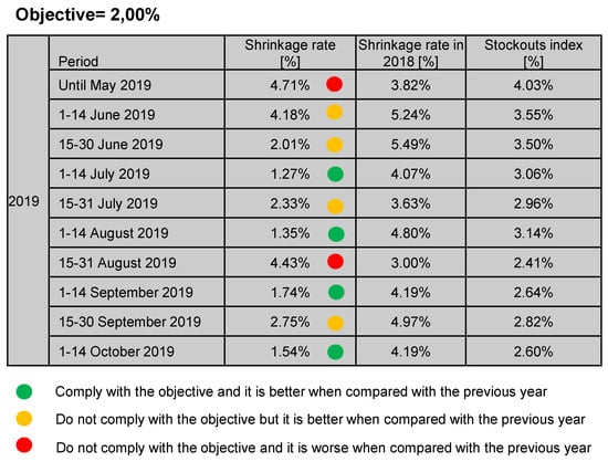 At the start of this study, the company faced poor performances in the shrinkage metrics, as well as in the product availability indicators. The term “shrinkage”, in this context, is applied with a different perspective, going beyond its traditional scope of a measure of lost sales. In this work, it includes situations of food waste due to poor handling, storage and display, exceeded expiration date, and similar factors. Given our focus on sustainability, it does not include events of theft, nor accounting errors, which are otherwise normally considered in this metric.