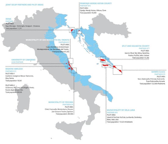 The Joint_SECAP project (Joint Strategies for Climate Change Adaptation in Coastal Areas), was financed by the Interreg Italy-Croatia programme and conducted between 2019 and 2021. The project aimed to build a common method to define joint sustainable energy and climate action plans (SECAPs) focused on sharing knowledge on climate change adaptation and mitigation measures for coastal areas of the Adriatic. The collaboration consisted of eight Italian and Croatian partners who identified at least one pilot area, for nine altogether, comprising a set of contiguous municipalities (Figure 1) where the process of defining joint adaptation actions to be included in a joint SECAP was tested in collaboration with local administrations (PAs). Only the Abruzzo Region identified two pilot areas: one coastal and one further inland.