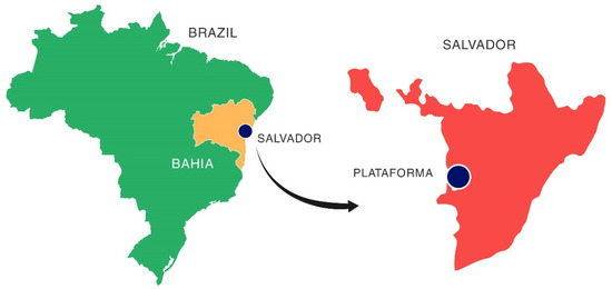 The dataset for our study was provided by the Cleaner Technology Network of Bahia (Teclim-BA) of the Federal University of Bahia (UFBA) as part of the network project “Rational Use of Water and Energy Efficiency in Housing of Social Interest” in which seven other Brazilian federal institutions of higher education participated. The study of UFBA was performed in the suburbs of Salvador, the capital of Bahia State, with the location highlighted in Figure 1.