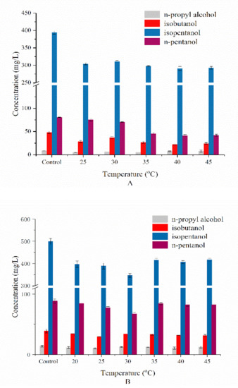 - Ma, L.J.; Huang, S.Y.; Du, L.P.; Tang, P.; Xiao, D.G. Reduced Production of Higher Alcohols by Saccharomyces cerevisiae in Red Wine Fermentation by Simultaneously Overexpressing BAT1 and Deleting BAT2. J. Agric. Food Chem. 2017, 55, 6936–6942. [Google Scholar] [CrossRef]