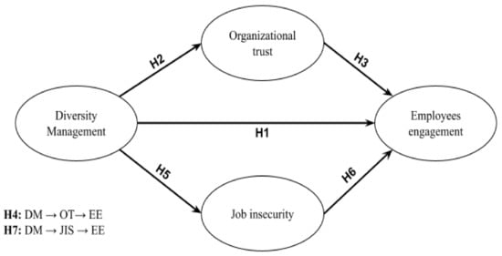 Many studies have looked over the mediating role of job insecurity between many variables, such as the study of Park and Ono [75], who explained how job insecurity could be a mediator between workplace bullying and work engagement with confirmed data from employees in Korea using the latent factor approach, as well as the study of Hsieh and Huang [76], who also studied the mediating role of job insecurity in peoples’ core self-evaluation and their job satisfaction, based on a survey made through 346 full-time employees in Taiwan. Furthermore, De Beer et al. [77] indicated that HR practices that aim to eliminate discrimination at the workplace and manage diversity can decrease the job insecurity between the black employees which, in turn, affects their job turnover, whereas it does not have any effects on their white fellows. From this perspective, we are interested in seeing the importance of diversity management in employees’ engagement toward their jobs to make more effort and have more energy and motivation to follow their companies’ goals and objectives. As a conclusion from the Hypothesis 5 and Hypothesis 6, we can suggest our Hypothesis 7 as follows: