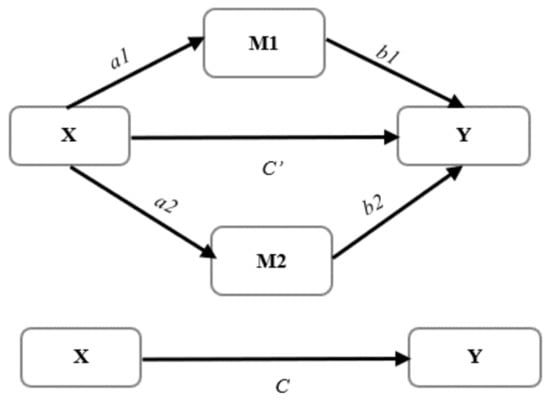 Hair et al. [96] recommended a method to test the mediation, which consists of two steps. To apply this method the researchers used SEM to assess the hypothesized mediating relationship. Testing the significance of the direct effects between the X variable to the other two variables (M and Y) is the first step, the second step is to examine the indirect effect of X on Y as follows (X → M1 → Y) and (X → M2 → Y). For these purposes, the techniques of SME’s path analysis were applied. It is used to evaluate whether the mediation effect between the constructs exists or not and to examine the type of mediation, i.e., full or partial mediation. To determine the level of mediation [97] (p. 89) has described the following points (see Figure 3):