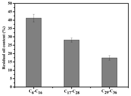 To evaluate the adaptability of b-MMODA to the target reservoir, the salt and temperature tolerance and the degradation rate of crude oil were investigated. A temperature test demonstrated that temperatures between 20 °C and 70 °C had no significant effects on the surface tension of the b-MMODA (Table 2). In order to clarify the effects of salt on b-MMODA, the surface tensions of solutions at different salt concentrations were tested. It showed that the solutions were not affected by the addition of CaCl2 at the tested conditions, indicating a high salt tolerance (Figure 4). In addition, the oil viscosity was kept 150 mPa·s ± 50 mPa·s within the salt concentration at a range of 10~22%. In addition, b-MMODA displayed a good biodegradation of crude oil, especially for heavy components (C29–C36), with a degradation rate of 82.6% (Figure 5).