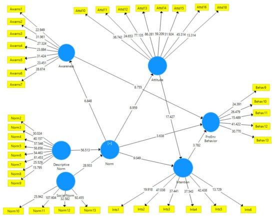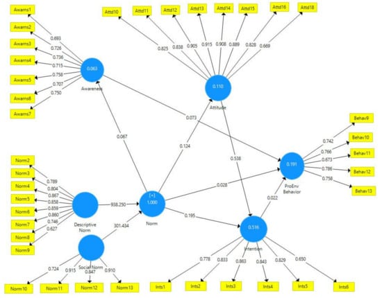 The measuring items for each latent variable need to be assessed for their validity level. The validity of the latent variable measurement model in this paper is seen from the cross-loading value. The measuring indicator of a latent variable is acceptable and valid as a measure of a latent variable if the value of the cross-loading on the variable concerned is more significant and the largest among the cross-loading values for other variables. The cross-loading of each item measuring the latent variable in this paper is set out in Table 10. For instance, columns 1–7 are latent variables in the table, while the leftmost column is an indicator. In column 1, there is an indicator of attitude. It appears that the value is 0.83 for the Attd10 indicator and 0.84 for the Attd11 indicator. When compared to the loading value in the other column (2–7) to the right, the loading value in that column is the largest and most significant. This suggests that Attd10 and Attd11 are the best indicators for the attitude variable, particularly when compared to other indicators such as Attd12, Attd13, Attd14, Attd15, Attd16, and Attd18. We can evaluate the awareness, intention, norm, and behavior variables’ item validity by using the same method. Items Awarns1–Awarns7 are the best measure of the awareness variable, with the highest loading when measuring other variables. Items Behav10–Behav13 are the best measures of the behavior variable, with a loading of 0.68 to 0.79 being the highest when used to measure other variables, while the intention variable mainly comprises indicators Ints1 to Ints6 with loading values ranging from 0.65 to 0.86. The norm variable is built in the second order, with the Norm10–Norm13 items having adequate loading values ranging from 0.72 to 0.92 and Norm2–Norm9 having loading values ranging from 0.65 to 0.82. These useful items are measures of each latent variable in the measurement model depicted in Figure 2 and Figure 3.