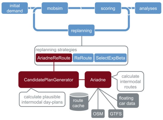 We aim to build a completely intermodal MATSim model that does not restrict mode combinations to access and egress of public transport but instead enabling a bike sharing trip between two public transport trips. Our model combines Ariadne with the concept from Hörl et al. [21]. In short, Ariadne is used to calculate a few realistic intermodal plans (for the agent’s day) and feeds them randomly into the simulation during the replanning phase in the MATSim loop (see Figure 2). The MATSim network only consists of car links while the detailed routes for other modes are calculated with a detailed intermodal graph by Ariadne. Mode availability and the location of the agent’s personal vehicles are taken into account. This means that the personal vehicles must be returned home at the end of the day and can only be used at a given location if the agent has previously driven there. Together with a caching mechanism for the intermodal routing process, this achieves a fully intermodal traffic simulation that converges towards a state of equilibrium quickly.