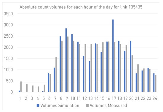 Figure 5 shows a comparison between measured and simulated traffic volumes for a counting point close to the city center. The simulated night-time activities are underrepresented as they are often carried out at the end of an agent’s day in hours 24–30.