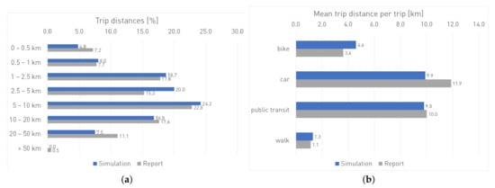 Figure 6a shows the percentage distributions of the reported and simulated trip distances. The distributions are largely in line with each other, with deviations for very short and very long distances; mid-range distances of 1 to 2.5 km are overrepresented. The fact that short distances are underrepresented is assumed to come from the fact that start and end facility locations of a trip are not drawn from the same cluster. Therefore, very short trips of less than 500 m are not adequately included. The overall average distance in the simulation is 7.5 km, which is slightly lower than the reported distance of 8.3 km. An explanation for this observation is that surveyed outliers (e.g., those trips >50 km) can greatly distort the average of reported travel distances. Figure 6b shows the average trip distance per main mode which is simulated quite correctly for every mode except for car. The modal split per distances category, as presented in Figure A1 (in the Appendix A), shows a quite correct pattern for all modes. Just the walk trips in between 1–2.5 km are overrepresented in the simulation.