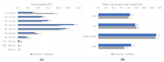 (a) Distribution of trips’ duration and (b) mean trip durations by main mode in the simulation (blue) and the report (grey).