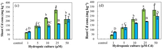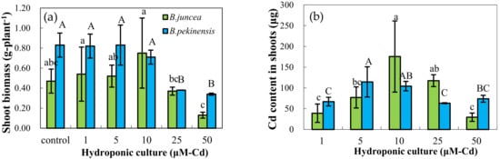 Shoot biomass and Cd concentrations in B. juncea and B. pekinensis grown in hydroponics, including shoot biomass (a), the content of Cd in shoots (b), the content of Cd in shoot (c) and the content of Cd in root (d). Different letters in a given column indicate if it is significantly different at p < 0.05.