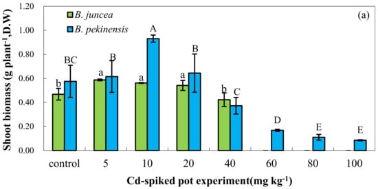 Shoot biomass (a) and the content of Cd in the shoot (b) of B. juncea and B. pekinensis grown in Cd-spiked soil for 1 month. Different letters in a given column indicate whether it is significantly different at p < 0.05.