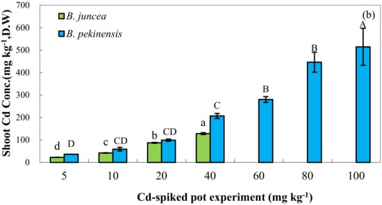 - Liu, C.P.; Shen, Z.G.; Li, X.D. Uptake of cadmium by different cultivars of Brassica pekinens 321 (Lour.) Rupr. and Brassica chinensis L. and their potential for phytoremediation. Bull. Environ. Contam. Toxicol. 2006, 76, 732–739. [Google Scholar] [CrossRef]