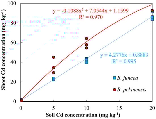 Under our experimental conditions, the concentration of Cd in the shoots of B. juncea (R2 = 0.995) and B. pekinensis (R2 = 0.970) were significantly correlated in the soil with <20 mg kg−1 of Cd (Figure 3). The bioconcentration factor (BCF) in both plants was much higher than 1 in all Cd treatments, which significantly decreased when the soil Cd concentration increased from 5 to 40 mg kg−1. However, the BCF reached 3.20 in B. juncea and 4.94 in B. pekinensis. The plants even grew in the treatment of 40 mg kg−1 of Cd.