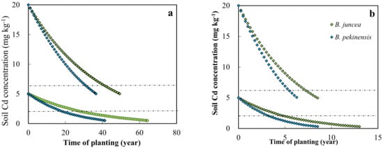For an initial content of 5 mg kg−1 of Cd in soil, it would take 13 and 8.5 years to reduce the Cd concentration in the soil to 0.3 mg kg−1 for B. pekinensis and B. juncea with a yield of 24 t ha−1, respectively (Figure 4a). In the case of the target 20 mg kg−1 of Cd in soil, 15 and 23 years would be required for B. juncea and B. pekinensis to reduce the Cd concentration in the soil to 5 mg kg−1. However, it would take a much longer time to clean up the soil with a plant biomass of 4 t ha−1.