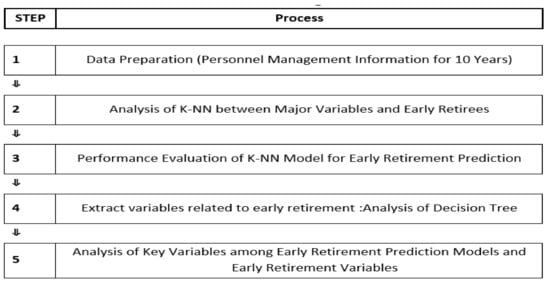 The analysis procedure of this study, as described earlier, is as follows. First, the data of the K-company are collected and converted in order to make them suitable for machine learning. Second, to find the possibility of the prediction of early retirement through personnel data, K-Nearest Neighbor (K-NN) was first applied to see if it was possible. Third, after the possibility of the prediction of early retirement was verified, Decision Tree was applied to analyze the causes of early resignation to trace the causes of the early retirement data group, and the relevant data variables are extracted. Fourth, based on the extracted causes of the early retirement group, its correlation from the perspective of HRD was interpreted. The causes of early resignation and implications in terms of HRD were analyzed. The details of the analysis procedures are shown in Figure 3.