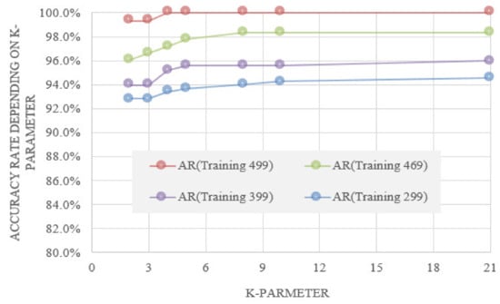The results of accuracy analysis based on each Training data and K-parameter value are shown in Table 7. As shown in Table 7, the K-Nearest Neighbor (K-NN) analysis model using 499 training data has the highest accuracy. However, in this case, the number of test data is small and the reliability of the model accuracy may decrease, and when checking the case where the training data are decreased and the test data are increased, the accuracy compared to the 499 model is decreased, but it is the smallest. It was confirmed that the accuracy of the 299 model for which the training data was written maintains a level of 93% or more. In addition, although there is a difference in accuracy with respect to the K-parameter value, all models show an accuracy of 90% or more. The result of summarizing the accuracy by training data and K-parameter value is shown in Figure 4.
