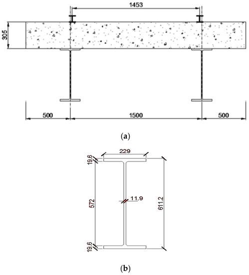 Configuration of the bridge in the working example (Unit: mm). (a) Girder system, (b) Cross-section of girder.