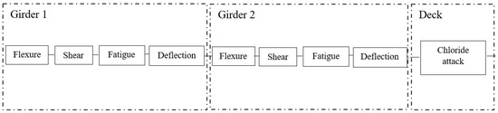 The bridge system consists of many components (e.g., deck, girder, etc.). A component can fail in many modes (namely, limit state). This paper focused on a steel–concrete composite bridge with the configuration shown in Figure 1, which is a common bridge type [30]. The failure of this bridge system is logically expressed in Figure 2. The system was modeled as a series system because maintenance needs to be performed when there is a violation of the limit state for any failure modes [28]. It is worth noting that bridge decks are usually overdesigned [31,32]. Thus, their flexure, shear deflection, and fatigue failure modes were not considered. Additionally, deterioration is normally inspected on bridge decks and girders for this bridge type [2]. Hence, the failure of bridge piers was not considered in this study.
