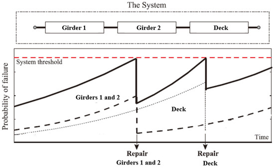 The optimization (Equation (1)) finds the number of maintenances and the time of each maintenance, i.e., . The most influential component within the system can also be determined at each maintenance time through this optimization. To be specific, the probabilities of failure of different components were determined and ranked (shown later in Equation (5)) in this optimization process. The component with the highest probability of failure was treated as the critical component, as bridge structure was considered a series system in this study. The maintenance action was only performed on the critical component and the cost of failure related to the repair for this component. This is shown schematically in Figure 3. Furthermore, the failure mode with the highest failure probability was repaired for the critical component.