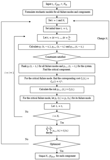 The search for with given constraints is an iterative procedure. Based on Baji et al. [16], the Genetic Algorithm method [16] is an efficient method in finding the optimum of complex problems with nonlinear constrains. Thus, in this paper. the flowchart in Figure 4 was coded using the Genetic Algorithm through MATLAB. As inputs, , and are case-specific with values summarized in Section 7 for the case study bridge. in this study. Since the maintenance of bridge is generally carried out every 5 years, the initial value of can be determined by letting , where [40].