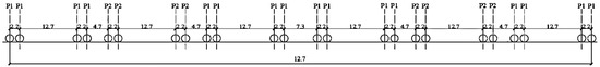 Bridge load modeling. The loading needed to be determined for the bridge girders. Based on the Department of Railway Transportation data, the superimposed dead load on the girder (including the self-weight of the deck, the railway ballast and track, and the weight of overhead structures) was determined to be 19.2 kN/m. Trains operating on the viaduct had four motor cars and two trailer cars. The axle load was 118 kN for a motor car () and 108.5 kN for a trailer car () for the tracks, as shown in Figure 5. The frequency of the train was 80 per day with COV of 0.05 [2].