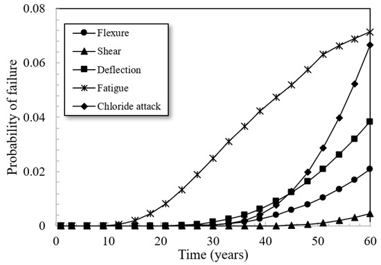 With variables given in Table 1 and the above preparations, the probability of failure of different failure modes was determined by Li and Melchers [29] over time. The probability of failure of each failure mode was the same for the two girders as they were subjected to identical loading conditions. The corrosion effect on sectional properties and mechanical properties at any point of time was related to the corrosion effect in previous times [37]. Therefore, there was a high autocorrelation among the corrosion effects at each point in time, and autocorrelation coefficient was selected as 0.9. It can be seen from Figure 6 that probability of failure for fatigue was the highest at each time point. This indicated that fatigue failure is the most critical failure mode for the bridges, and more care should be taken to protect the girder from fatigue damage. The changes in probability of failure for different bridge components (i.e., girders and deck) and the entire bridge system were then determined based on Equations (2)–(5), with the results shown in Figure 7.