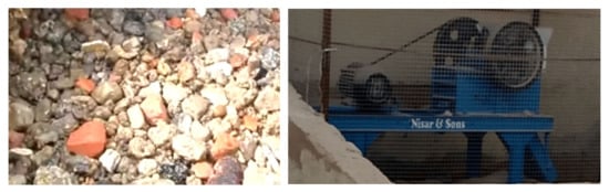 Recycled concrete aggregates (RCA) were obtained from the available debris of tested beams used in past research work conducted at the Department of Civil Engineering, NED University of Engineering and Technology. As mentioned by Meng et al. [], RAC has a greater scattering of properties due to variability of the properties of RCA, therefore, the strength and batch of concrete beams cast to acquire RCA were consistent in this study. The compressive strength of the tested beams to acquire RCA was 20.68 MPa [] and had no previous exposure to carbonation. The recycled coarse aggregates were crushed in a jaw crusher, as shown in Figure 1.