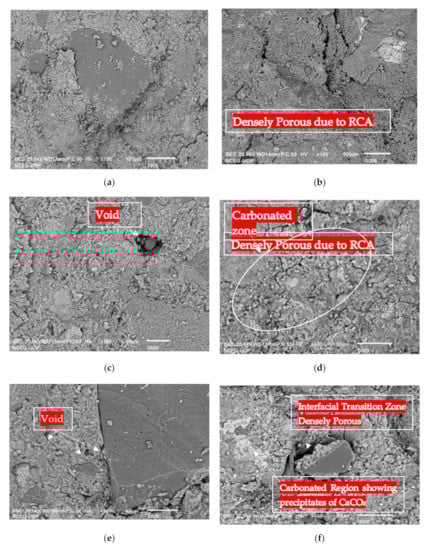 The concrete microstructure was captured using a scanning electron microscope (SEM). The microstructure of non-carbonated and carbonated concretes with and without RCA and produced using w/c ratio of 0.4 and 0.43 is shown in Figure 4 and Figure 5 for an exposure period of 90 days. Figure 4 shows the microstructure of carbonated concrete with and without recycled aggregate with a w/c ratio of 0.4 exposed to simulated and natural environments. The microstructure shown in Figure 6 shows that mixes containing natural coarse aggregates (i.e., M0-0.4) are less porous than those containing 30% RCA. Overall, the microstructure of concrete exposed to a natural environment contains visible pores and cracks in comparison with the natural environment. This may lead to inferior performance and strength results for the mixes exposed to the natural environment. The microstructure of non-carbonated and carbonated concrete with and without RCA produced using a w/c ratio of 0.43 is shown in Figure 5, and a similar observation as indicated in Figure 4 was found. ITZ between cement mortar and aggregate is the most important interface, particularly in the case of recycled aggregate concrete. The reason is that concrete containing RCA has more interfaces than conventional concrete []. This includes ITZ between actual aggregate and old mortar and the other interface between the adhered old and new mortar (refer to Figure 4d and Figure 5f).