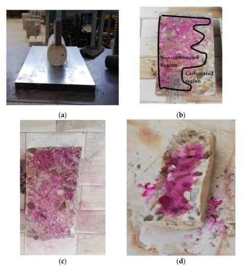 The 36 cylinders exposed in the carbonation chamber and the natural environment for the duration of 90, 180 and 365 days were split into two pieces under a Universal testing machine (refer to Figure 6a) that tested for splitting tensile strength. The split pieces were used to determine the carbonation depth as per the provision of the CEN test []. The phenolphthalein was sprayed on the split pieces of the cylinders exposed to the simulated environment to observe the change in the color from bright pink/purple to colorless or light pink. As shown in Figure 6b, the colorless or light pink region is representative of carbonated concrete; therefore, the depth of the carbonated region was measured using a scale. A typical view of carbonated cylinders exposed to simulated and natural environments is shown in Figure 6c,d). The values of carbonation depth for mixes M0-0.4, M30-0.4, M0-0.43 and M30-0.43 exposed to the simulated and natural environments are shown in Figure 7a,b).