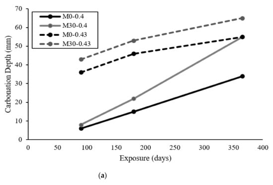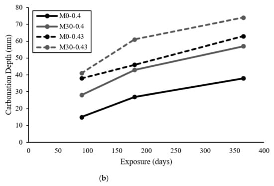 It can be observed in Figure 7 that less carbonation depth was observed in the mix, which was produced using less w/c ratio (i.e., 0.4) and natural aggregates (i.e., Mix M0-0.4), whereas the highest carbonation depth was observed in the mix cast using w/c = 0.43 and recycled concrete aggregates (i.e., Mix M30-0.43). These results are coherent with the results reported in the literature by Fung [] and Silva et al. [], who reported that the carbonation depth of RAC increases with the increase in the replacement percentage of natural aggregates by the recycled aggregates in a concrete mix. The increase in the carbonation depth in the case of recycled aggregate can be associated with the porosity of RCA (in the paste adhered with the actual aggregate) which may have a profound influence on the carbonation depth.