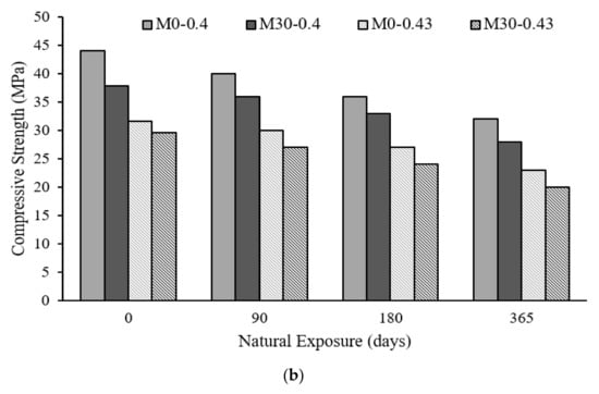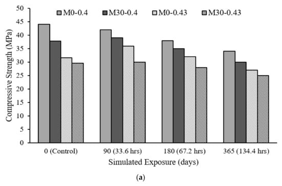 From Figure 8a, it can be concluded that cylinders exposed to the simulated environment were found to have slightly higher compressive strength as compared to the one exposed in the natural environment. In general, the long exposure period affected the compressive strength. A similar observation is also reported by Ali et al. [], who reported that the CaCO3 reduces the compressive strength of a matured concrete as compared to the one without CaCO3.