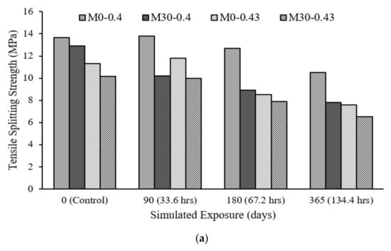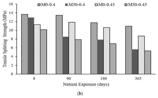 The concrete cylinders of each batch of mix prepared using w/c ratio of 0.4 and 0.43 were tested for splitting tensile strength as per ASTM C496/496M procedure [] after the exposure to carbonation in both simulated and natural environments. The results for concrete cylinders exposed to the simulated and natural environment for both batches of concrete are shown in Figure 9a,b. From the following figures, it can be observed that the splitting tensile strength in concrete decreases as the exposure duration increases which is due to the presence of RCA in the concrete batch. Also, mixes M0-0.4 and M0-0.43 exhibited higher splitting tensile strengths as compared to mixes M30-0.4 and M30-0.43 at all ages of carbonation exposure due to the presence of natural coarse aggregates.
