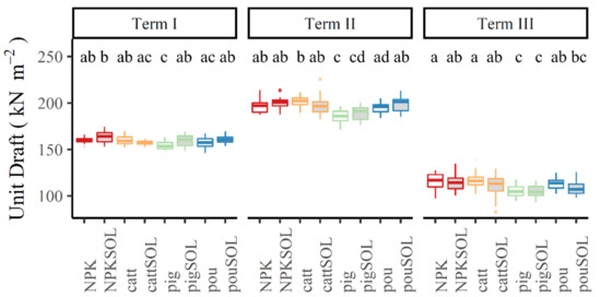 UD results are given in Figure 1, which also shows the multiple comparison analysis results based on Tukey’s HSD test. The differences among investigated seasons were highly influenced by varying soil moisture during soil tillage, the type of the tillage implement used, and the depth of tillage. Therefore, comparisons of variants’ UD were performed separately according to the particular terms by the one-way ANOVA. Statistically significant differences were detected for both pig manure variants, i.e., pig and pigSOL. Compared to NPK, NPKSOL, catt, and cattSOL, the pig manure variants attained considerably lower UD at Terms II and III. Pure pig manure variant (pig) values significantly differed from those obtained by NPK, NPKSOL, and catt at Term I. Otherwise, no notable differences were found. In the case of pigSOL, there was a gradual reduction in UD (relative to the NPK variant), overall reaching more than 10%. This decrease could result in fuel savings of about 1 L ha−1 (assuming an average power delivery efficiency of around 50% and the fuel requirements of tillage operations at a level of 20 L ha−1).