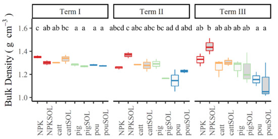 Figure 2 shows the results of soil bulk density analysis after calculating the final values. In general, BD is a relatively constant indicator that has a key effect on, for example, soil infiltration. At Term I, relatively homogeneous values could be observed, though they changed during the following years. In this regard, the overall difference between Term I and II was found to be statistically significant. A degressive reduction in BD could be observed, particularly with the application of poultry manure and pigSOL. The importance of organic matter in soil is reflected in the highest BD values of variants without any type of manure supply, i.e., NPK and NPKSOL. Furthermore, the NPKSOL variant demonstrated a gradual increase in values during the monitored periods. The pig variant always presented higher BD values than the pigSOL variant. Applying the factorial (term; manure type; NeOsol treatment) analysis of variance though the factor of NeOsol, i.e., regardless of manure type and term, demonstrated no significant differences. Concerning manure type, pig and poultry showed significantly lower BD values than variants where no manure was applied, with the poultry manure’s BD values significantly differing compared to the cattle manure. Regarding individual terms, Term II provided significant decreases in BD compared to Term I.