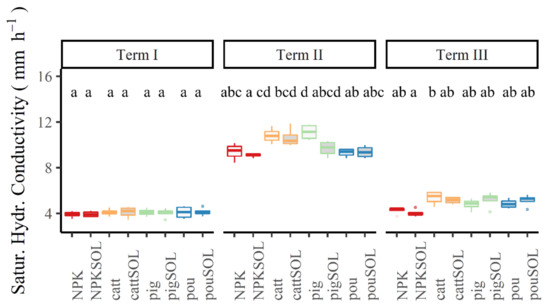 Figure 3. Saturated hydraulic conductivity within variants during the three investigated seasons. Error bars indicate the standard deviation, and letters represent multiple comparisons according to the results of Tukey’s HSD test.