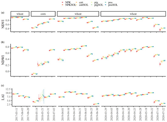 Figure 4. Crop status in terms of (a) crop health and biomass represented by the Normalized Difference Vegetation Index (NDVI), (b) crop water content status represented by the Normalized Difference Water Index (NDWI), and (c) canopy leaf area represented by the Leaf Area Index (LAI). Indices were derived from Sentinel-2 satellite imagery during the 2017-2020 cropping seasons. Error bars represent the standard deviation of index (pixel) values within each investigated small plot.