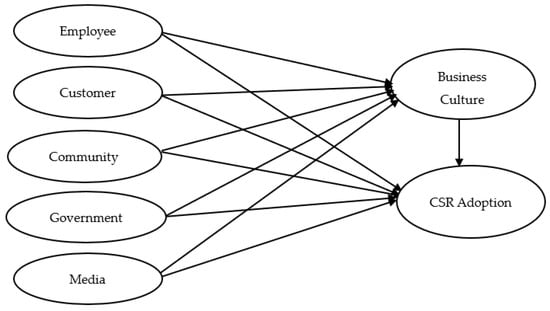 This study proposed the following conceptual research model to explore the empirical relationships among all driving factors of stakeholder pressures on CSR adoption. The independent variables are stakeholder pressure with the driving factors of employee, customer, community, government, and media. The outcome variable is adoption of CSR practice. Hence, the conceptual framework of the derived model tried to verify, estimate the fitness, and supported by the stated hypothesis in line with the indirect and direct effects of mediation variable CSR-oriented business culture.