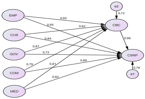 Weighted multiple regression analysis is essential for determining which coefficient should be used as an indicator in multiple regression analysis to determine a variable’s contribution to prediction [96]. The weighted multiple regression results are important in this study because they allow opportunities to examine the interactions between the explanatory and response variables. Hence, this research looked at employee, customer, government, community, and media as drivers of stakeholder pressure, with CSR practices as the outcome variable and business culture as the mediation variable. The determined values of all parameter estimates (β) ranged from government (GOV) 0.702, media (MED) 0.802, customer (CUS) 0.841, community (COM) 0.894, employee (EMP) 0.952, to CSR practice (CSRP) 0.820, which more likely have positive and significant connections, with a direct impact as shown by the weighted multiple regression analysis result.