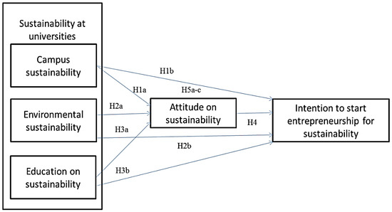 Universities do not only prepare specialists. They are responsible for the creation of socially responsible people, and higher education is credited with the potential to strengthen social and economic growth [43]. The education provided will, in the end, shape positive attitudes, which further on can foster entrepreneurial intentions towards sustainability. Attitudes have the capacity to influence the role of campus sustainability and environmental sustainability onto entrepreneurial intentions, but also in a direct way.