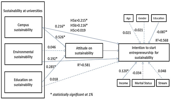 The mediating role of attitude on sustainability was assessed. It was revealed that attitude on sustainability plays a significant mediating role between campus sustainability and sustainable entrepreneurial intentions and between education on sustainability and sustainable entrepreneurial intentions. Hence H5a and H5b were supported. Surprisingly, attitude towards sustainability did not offer any mediating effect between education on sustainability and intention to start entrepreneurship for sustainability. Therefore, H5c was not supported, as shown in Table 5.