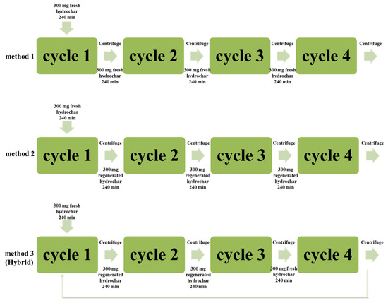 In adsorption experiments, LEA hydrochar samples were used for the removal of heavy metals from the metal solution. First, the effect of contact time (20–480 min) and adsorbent loading (50–500 mg) on each metal was studied by varying one variable at fixed values of the other variable. The optimum values for the two parameters, defined as those that led to the highest metal removal, were then utilized for all subsequent experiments at room temperature, as shown in the schematic representation of Figure 1. More specifically, three metal removal methods were tested with each one consisting of four in-series batch cycles. In method 1, during each cycle fresh hydrochar was utilized as feedstock, whereas in method 2 fresh hydrochar was used only in cycle 1, and each adsorption cycle was followed by desorption to generate so-called regenerated hydrochar. Finally, method 3 (hybrid) consisted of a combination of method 1 and method 2 with fresh or regenerated hydrochar (Figure 1) added to 20 mL of metal solutions in a 125-mL Erlenmeyer flask and placed in a shaker at 120 rpm. Briefly, in method 3, during the first cycle, fresh hydrochar was utilized as adsorbent and was regenerated for cycle 2 and cycle 3 by desorption. At the end of cycle 3, fresh hydrochar was utilized again and was then regenerated for 2 cycles in a closed-loop process. At the end of each cycle, the solution was centrifuged at 7000× g for 10 min (Eppendorf 5430 R centrifuge, Hamburg, Germany) to separate the metal solution from the solid hydrochar, which was oven-dried overnight under vacuum at 110 °C (Thermo Fisher). Metal removal was determined using the following equation: