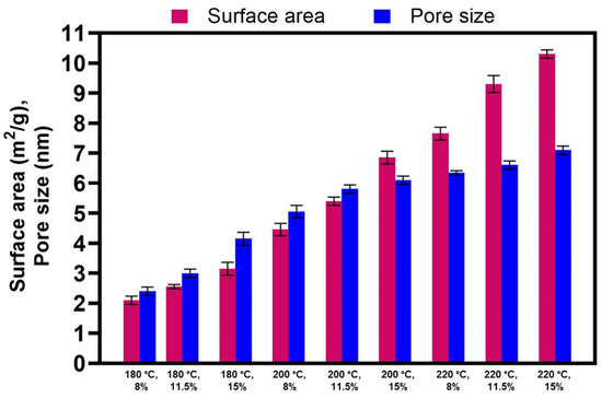 The surface area and average pore size of generated hydrochar samples ranged from 2.1 to 10.3 m2/g and from 2.4 to 7.1 nm, respectively (Figure 3). The significant increase (5-fold) in the surface area of hydrochar with increasing carbonization temperature can be attributed to thermal pyrolysis taking place at high temperatures [33]. In general, the surface area of hydrochar is usually significantly smaller compared with biochar obtained from pyrolysis [34]. Moreover, at low temperatures tarry substances form and plug the pores resulting in a low surface area [35]. Finally, the feedstock used for the HTC reaction affects the surface area and porosity as starch leads to a surface area up to 400 m2/g, whereas algae result in surface area up to 30 m2/g [36]. The most common way to enhance the surface properties of hydrochar is chemical or physical activation [36].