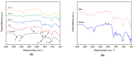 FTIR spectra of (a) P. oculatum, LEA, and hydrochar samples prepared at 180, 200, and 220 °C; (b) hydrochar before and after adsorption. Peak identification: (1) -OH; (2) C-H, C=CH-, -CH2, and -CH3; (3) C=C=C; (4–6) C=O, C=C, N-H; and (7) -C-O-R and -C-O.
