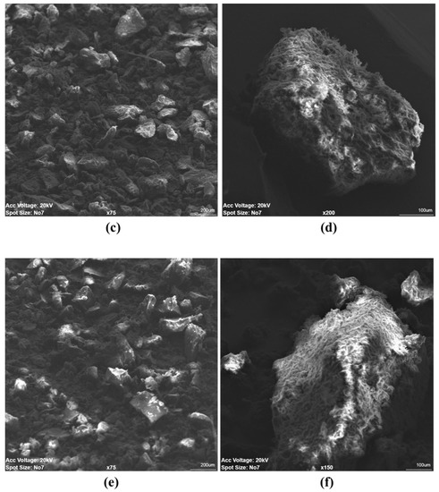 SEM images of Picochlorum oculatum (a) cells; (b) LEA; (c) hydrochar at 180 °C (magnified × 75); (d) hydrochar at 180 °C (magnified × 200); (e) hydrochar at 220 °C (magnified × 75); (f) hydrochar at 220 °C (magnified × 150).