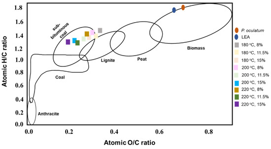 The changes in H/C and O/C atomic ratios during HTC are commonly shown in Van Krevelen diagrams to compare combustion properties based on hydrogen, oxygen, and carbon content (Figure 7) [42,43]. For all prepared hydrochar samples there was a reduction in both atomic ratios due to dehydration (loss of H) and decarboxylation (loss of C) reactions, thus rendering the hydrochar a better solid fuel than the LEA [44]. This reduction in atomic ratios results in an increase in the high heating value (HHV) of hydrochar [44], which ranged from 24.6 to 29.9 MJ/kg and was approximately 1.7 fold-higher than LEA, hence close to sub-bituminous coal (25–30.5 MJ/kg) [45]. The energy yield (%) ranged from 36.9 to 61.1 with the maximum achieved at 180 °C and 15% solids loading.