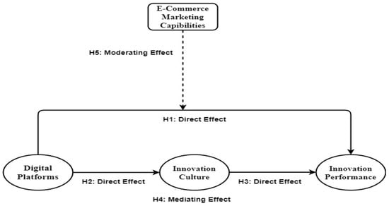 Figure 1 demonstrates the relationships among the study constructs. The four variables are as follows: digital platforms are an independent variable; innovation culture is a mediating variable; e-commerce marketing capabilities are a moderating variable; IP is the dependent variable.