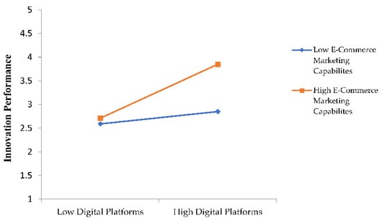 Previous research showed the progressive function of digital platforms for developing the e-commerce marketing capabilities of an organization (e.g., [,]). E-commerce marketing capabilities play the role of moderator between digital platforms and IP. The digital platforms of an organization have been conceded to have a key effect on the execution of e-commerce activities online and lead the organization towards IP []. This research work proposes that with a strong relationship between digital platforms and IP, the moderating effect of e-commerce marketing capabilities cannot be ignored. E-commerce marketing activities help firms engage in successful e-commerce processes and increase their IP.