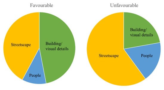 | Group 4 | Lively activities, old buildings, planters and parks, street furniture, solar panel street lighting. | Poorly maintained buildings, sidewalks, traffic behaviour, empty buildings, waste, and poor signage. |