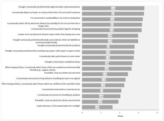The graphic expression of the responses (Figure 1) shows that the expression of sustainable behavior of the respondents is mainly related to daily routine, i.e., when buying food products the seasonality and the availability of local products are taken into account, the purpose of using household appliances is to use them effectively (to switch them off when not in use), to save water, and to increasingly use the reusable bags in the shops, etc. Sustainable behavior is pursued at work as well as during studies. The research has showed that the weakest sustainable behavior of the youth is noticed while travelling, in their selected means of transport, or in buying second-hand items (clothes, equipment). It is important to emphasize that buying second-hand items is one of the sustainable behavior expressions which allows young people to add some items to their wardrobe without using additional resources in the manufacturing process. It is a very important expression of sustainable behavior as the fashion industry is responsible for 8–10% of global carbon emissions.