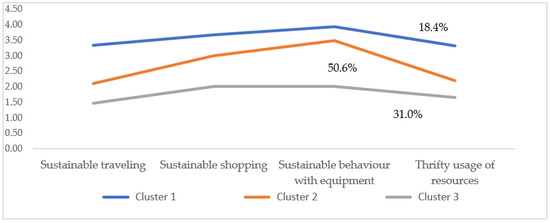 In order to divide the respondents into groups by their expressed sustainability (“How sustainable am I?”) the cluster analysis was made. As the number of the surveyed topics and subjects to be classified was considerably high, a k-means cluster analysis was chosen. The structure of the clusters was reflected by breaks. The surveyed were typologized by 5 scales of statistical evaluations: 5—“always”, …, 1—“never”. The most informative and easy-to-interpret representation of this data by dynamics is the respondents’ division into 3 clusters—presented graphically in Figure 2.