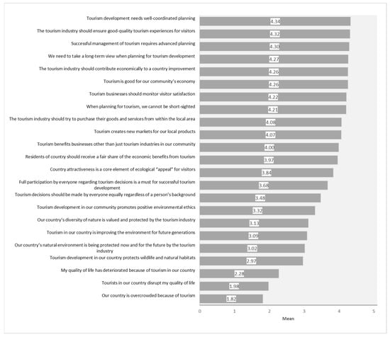 Trying to find out the attitudes of the youth toward sustainable tourism, the SUS-TAS scale of attitudes of sustainable tourism development, composed on the basis of a validated variant by Sirakaya-Turk and Gursoy (2013) [75], has been presented. The 23-question scale, Attitudes toward Sustainable Tourism, aims to identify respondents’ attitudes toward social, economic, and ecological factors of sustainable tourism, tourism planning and management, and aspects of public and personal participation (evaluation scale: 5—strongly agree, …, 1—strongly disagree). The graphic expression of the responses (Figure 3) shows that, at present, respondents’ attitudes toward the sustainable development of tourism are mainly related to economic and managerial dimensions—i.e., responses related to a need for well-coordinated sustainable tourism planning, the highest quality of tourism business services that would ensure visitors’ needs, successful tourism management, and the assurance of economic benefits of sustainable tourism—achieved the highest rating. The research has shown that statements, such as “Our country is overcrowded because of tourism”, “Tourists in our country disrupt my quality of life”, “My quality of life has deteriorated because of tourism in our country”, “Our country’s natural environment is being protected now and for the future by the tourism industry”, etc., obtained the lowest rating.